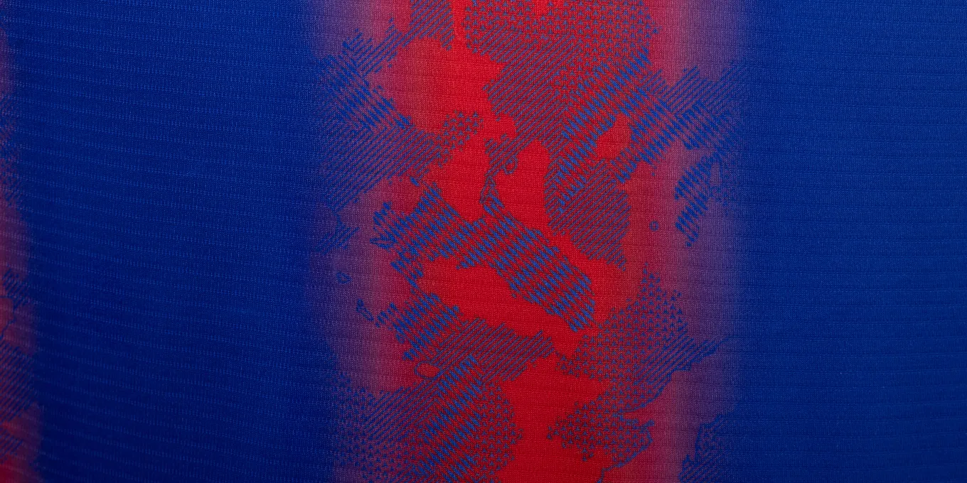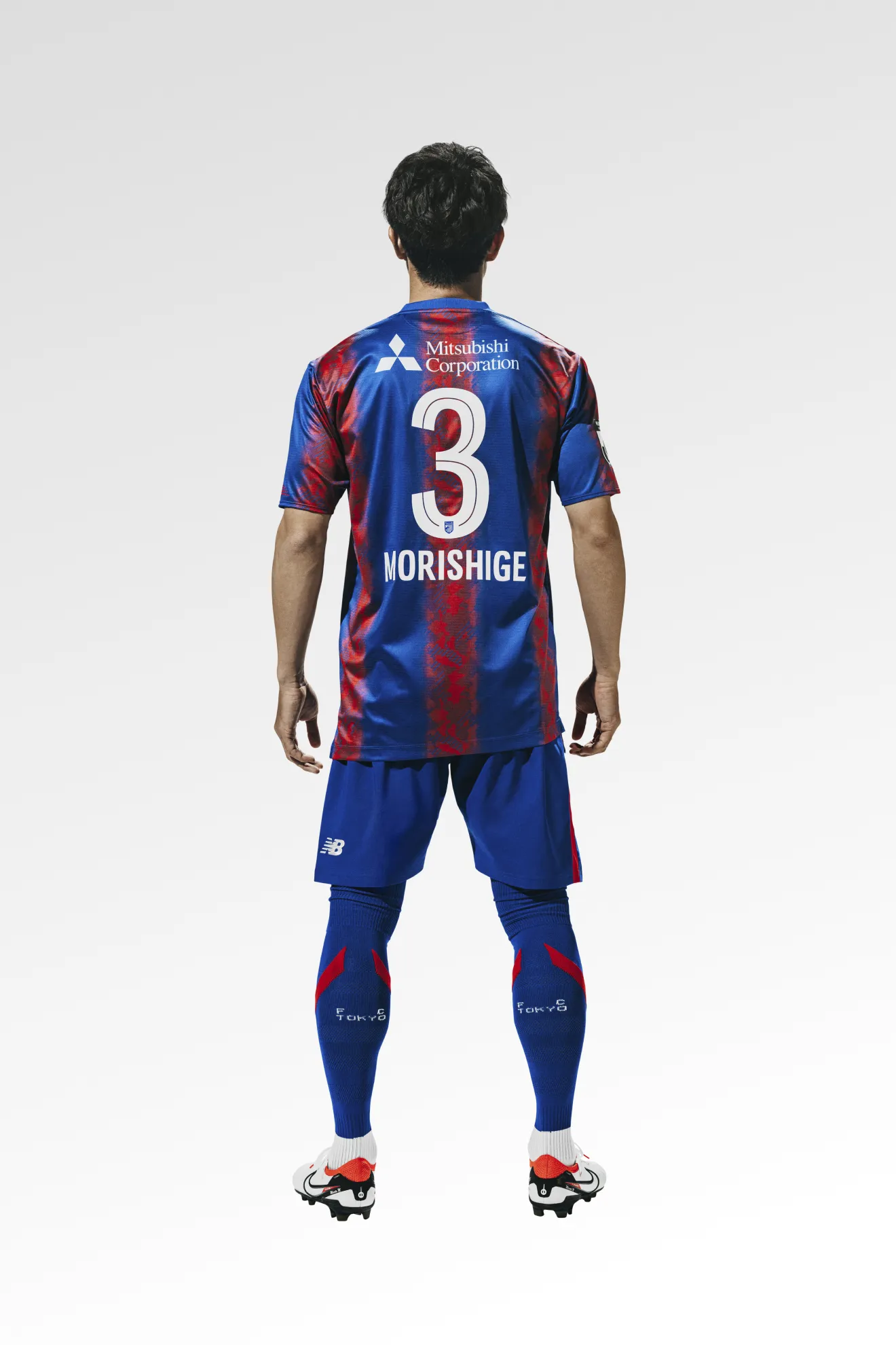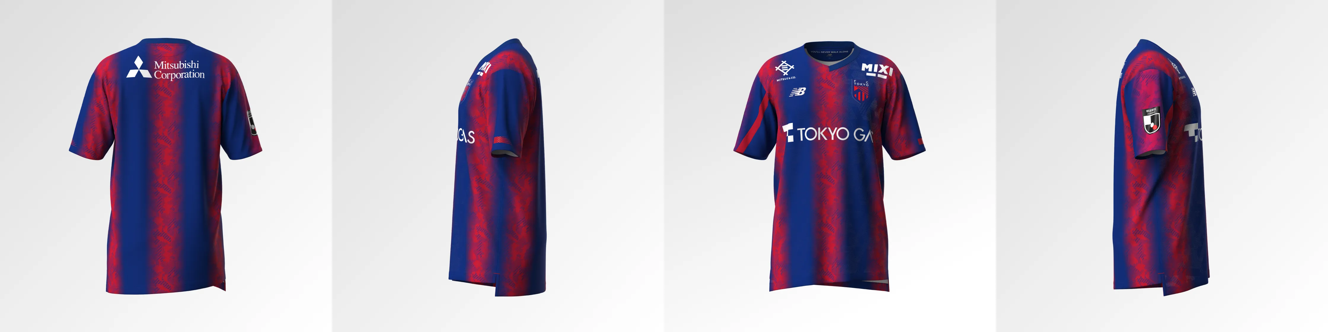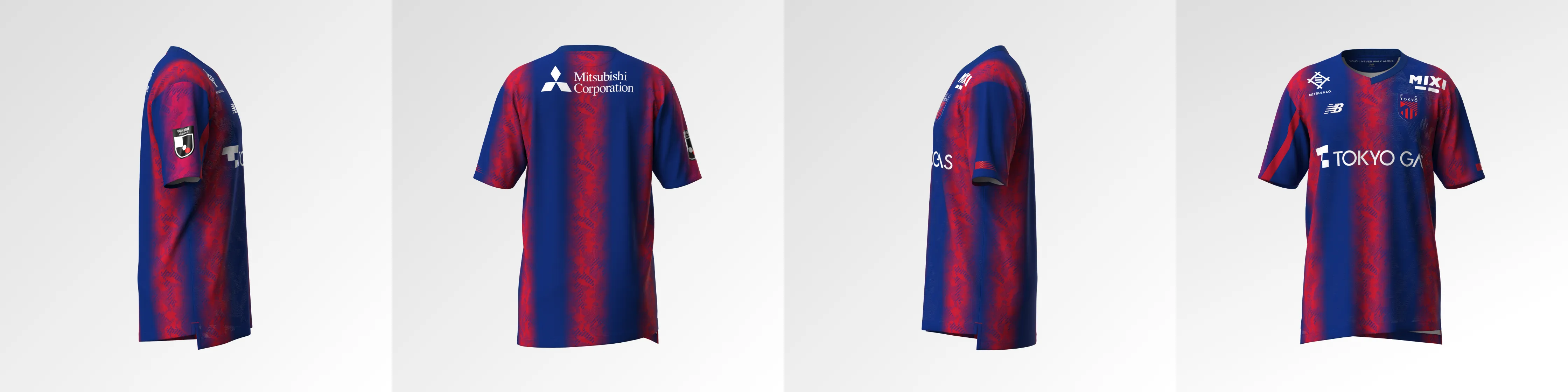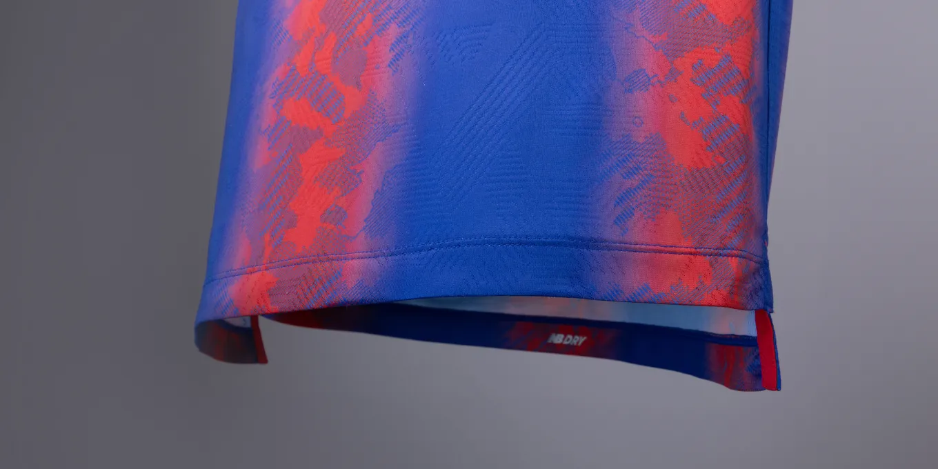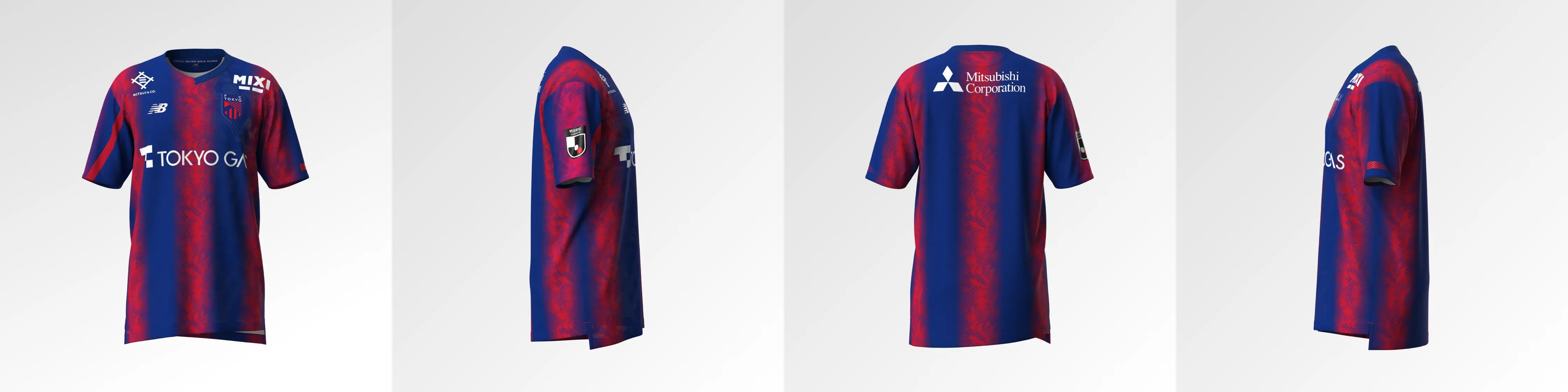 Das neue Trikot von FC Tokyo für die Saison 2024 mit dem neuen Emblem drückt die blauen und roten Streifen, die auch das Symbol des Clubs sind, in einem Farbverlauf aus und verwendet an Kragen, Ärmeln und Saum ein asymmetrisches Muster, das ein stilvolles, typisch tokyoerisches Bild erzeugt. Darüber hinaus ist die Basis des Trikots mit dem Monogramm „Mega Speed“ gestaltet, einem Symbol von New Balance Football für die Saison 24.
