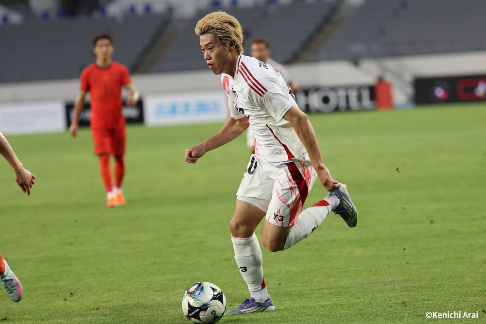 Dennoch ging er in der 28. Minute der ersten Halbzeit auf der linken Seite im Eins-gegen-Eins vor und drang tief in die gegnerische Hälfte ein, wodurch er Mao HOSOYAs (Kashiwa Reysol) entscheidenden Kopfball vorbereitete. In der 40. Minute setzte er am Seitenlinienrand ein heftiges Pressing ein, zeigte seine körperliche Stärke und brachte geschickt seinen Körper dazwischen, um den Ball zu erobern, wodurch er sowohl in der Offensive als auch in der Defensive immer wieder seine Qualitäten zeigte.