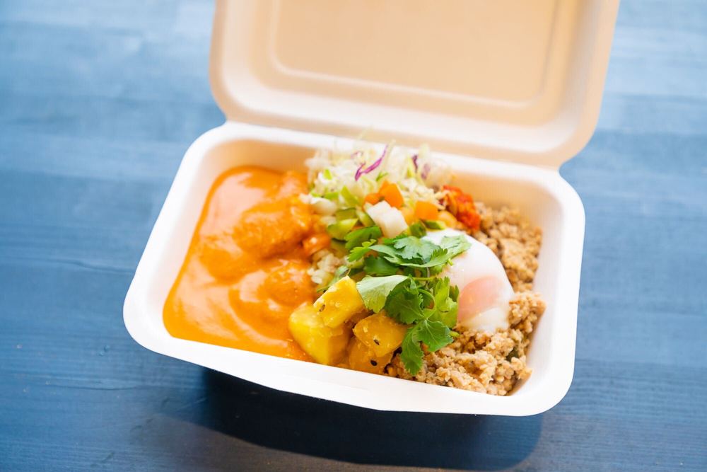 ・Butterhähnchen-Curry & Gapao mit Onsen-Ei 850 Yen