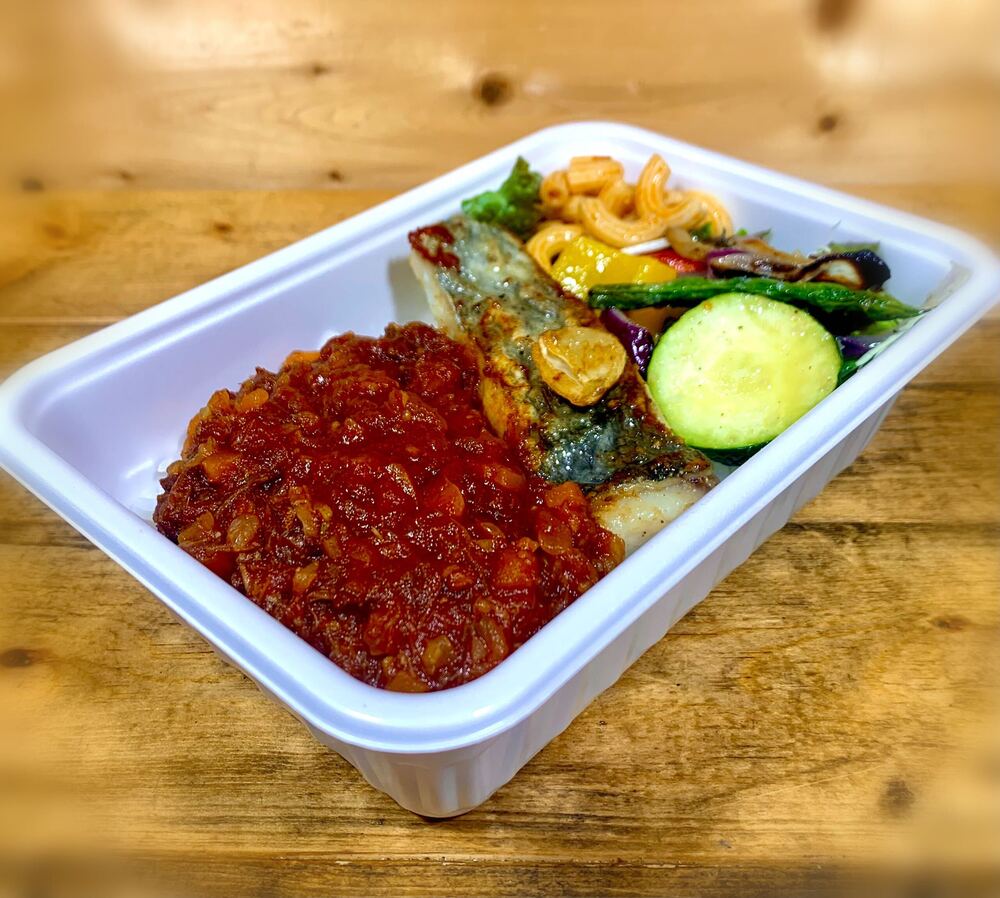 ・Schweineragout und Weißfisch Aglio e Olio, passend zum Reis 1.200 Yen