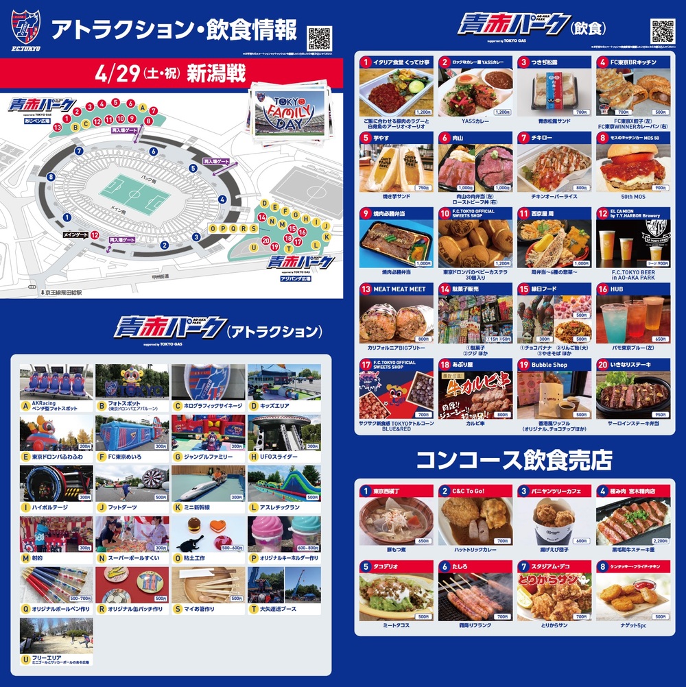 Dies ist das Speisenangebot, das am Sa., 29.04. (Feiertag) beim Spiel gegen Albirex Niigata im AO-AKA PARK supported by TOKYO GAS (Außenbereich) sowie an den Verkaufsständen im Stadioninnenbereich (Innenbereich) erhältlich sein wird.