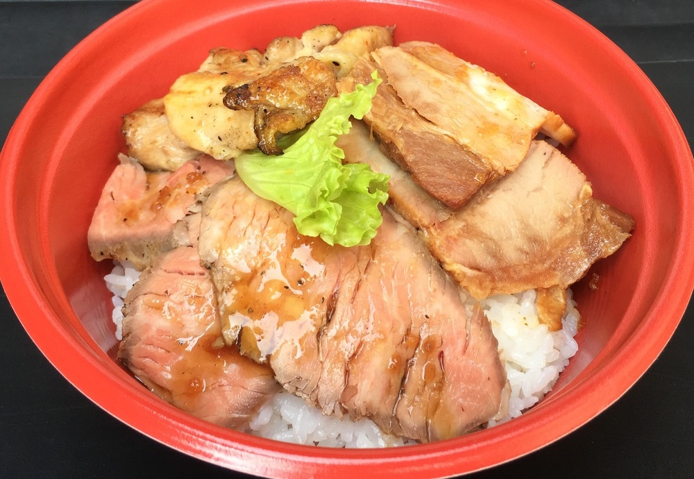Eine dreifarbige Schüssel mit Rind (Roastbeef), Schwein (Char Siu) und Huhn (Holzkohlegrill). Ein luxuriöses Gericht, bei dem Sie den Geschmack jedes Fleisches auf einmal genießen können! (Verwendung des Tokyo E-Zeichens und Kai no Sei)