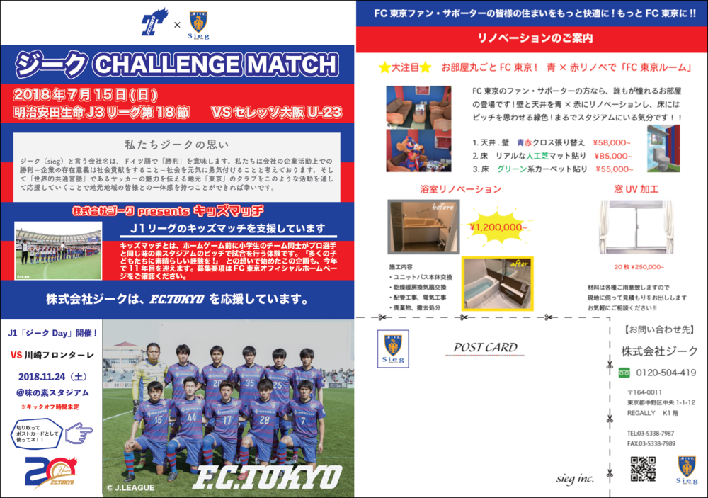 FC Tokyo veranstaltet am So., 15.07.2018 im Rahmen des 18. Spieltags der Meiji Yasuda J3 League gegen Cerezo Osaka U-23 (Anstoß 17:00 / AJINOMOTO FIELD NISHIGAOKA) mit Unterstützung des Club-Sponsors Sieg Corporation das „Sieg CHALLENGE MATCH“. Wir laden Sie herzlich ein, gemeinsam mit uns zu kommen!