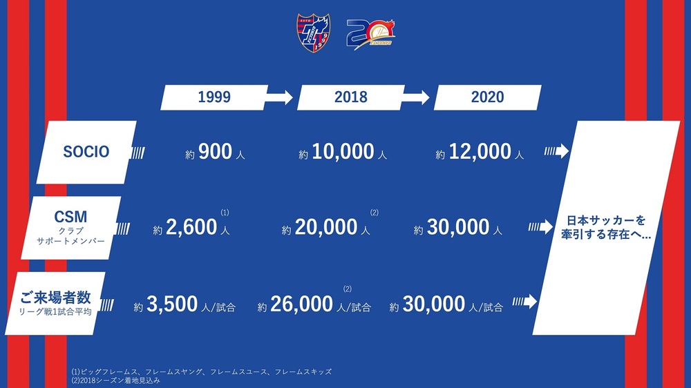In der FC Tokyo 2020 VISION haben wir als Ziel die Erweiterung der FC Tokyo Familie definiert, darunter 12.000 SOCIO-Mitglieder, 30.000 Club-Support-Mitglieder und eine durchschnittliche Zuschauerzahl von 30.000 pro J1-League-Spiel, doch diese angestrebten Werte wurden bisher nicht erreicht.