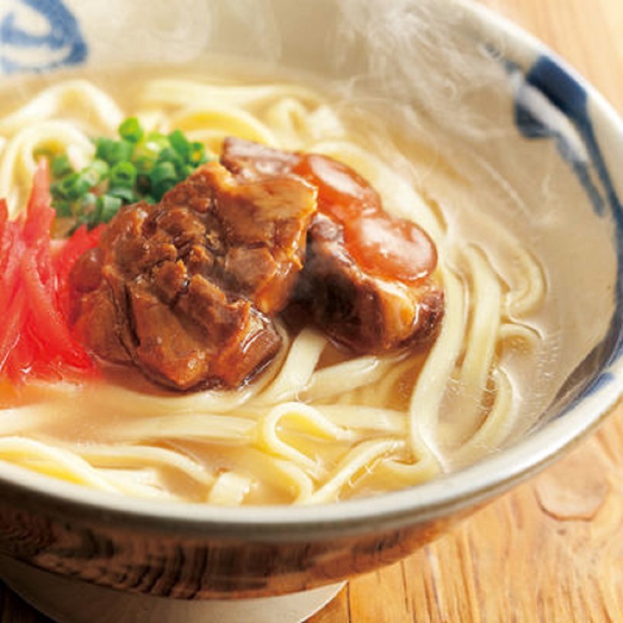 Sōki Soba mit Schweineknochenknorpel, der so lange gekocht wurde, bis er zart und weich ist. Ein perfektes Gericht für das Mittagessen.