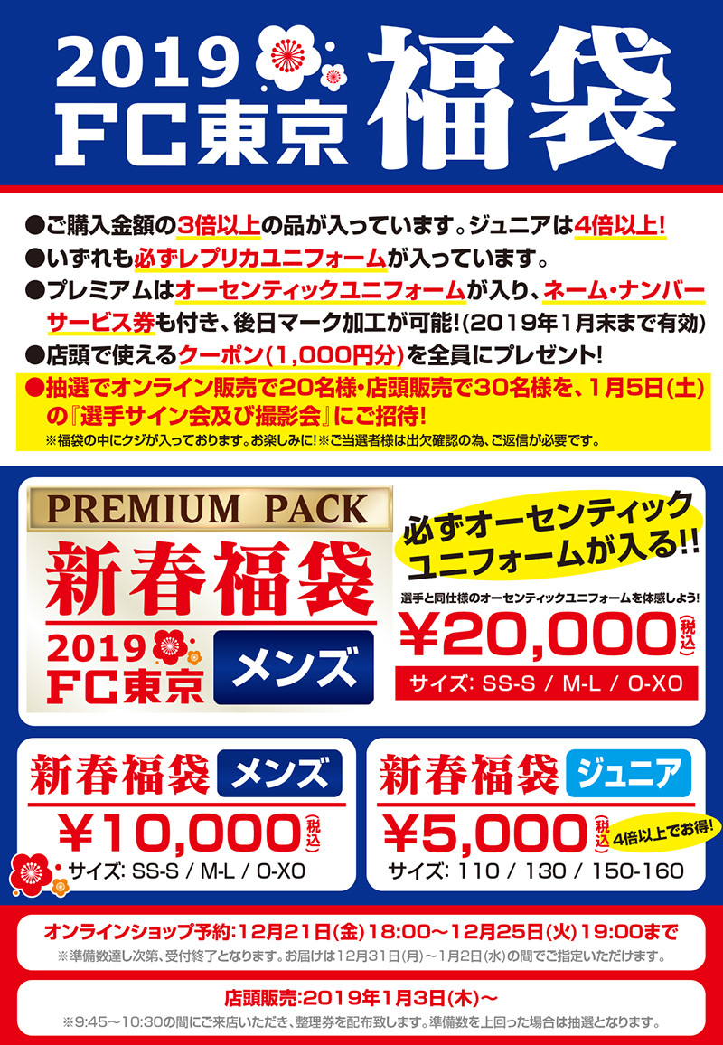 Im FC Tokyo Official Shop „Eurosports Ajinomoto Stadium“ findet wie jedes Jahr der Verkauf der Glückstüten statt. Wir informieren Sie hiermit darüber. Bitte nutzen Sie diese Gelegenheit, um Ihre Glückstüte zu erwerben!