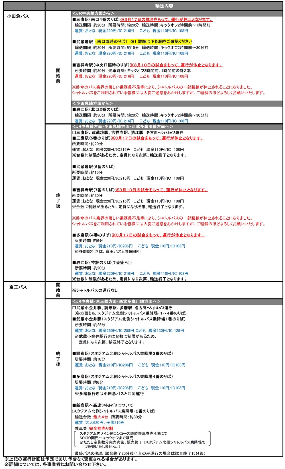 【Nachtrag Sa., 09.03.】Wir haben eine Mitteilung von Odakyu Bus zur Änderung der Haltestelle für den Direktbus vom Südausgang des Bahnhofs Musashisakai zum Ajinomoto Stadium hinzugefügt.