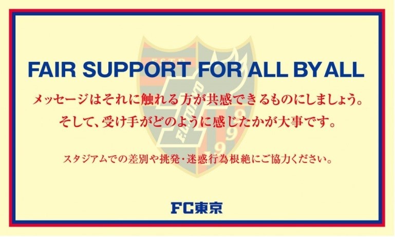 Unter Berücksichtigung des einheitlichen Verbots der J-League, das „diskriminierende oder beleidigende Äußerungen oder Handlungen aufgrund von Rasse, Hautfarbe, Geschlecht, Sprache, Religion, Politik oder Herkunft“ untersagt, hat FC Tokyo im September 2014 die Botschaft „FAIR SUPPORT FOR ALL BY ALL“ veröffentlicht und setzt sich für die Ausrottung von Diskriminierung, Provokationen und störendem Verhalten ein.
