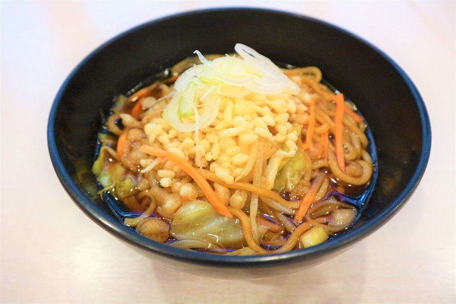 „Ein lokales Gourmetgericht aus der Präfektur Aomori, bei dem Yakisoba mit einer japanisch inspirierten Brühe vermischt wird! Bitte probieren Sie es bei dieser Gelegenheit unbedingt!“
