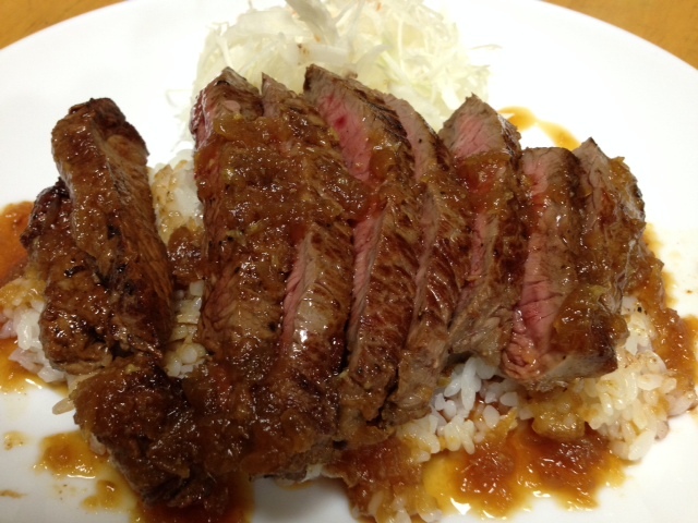 „Dünn geschnittenes, dickes Fleisch wird auf einer heißen Eisenplatte zart gebraten. Ein Gericht mit vollem Volumen.“