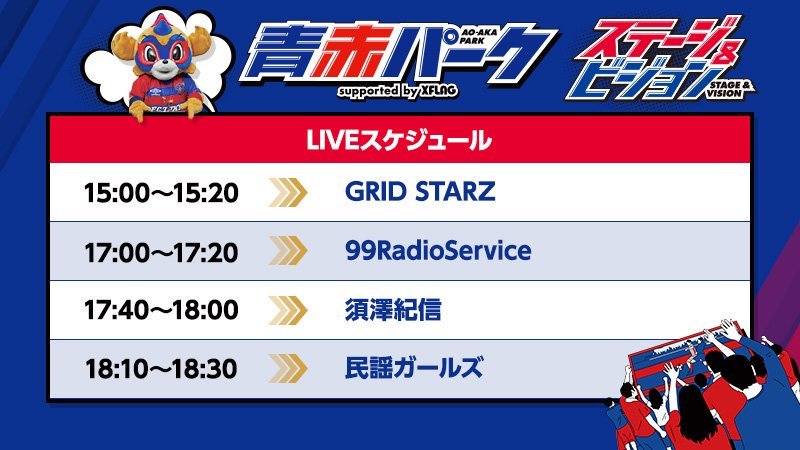 【Durchführungszeit】14:00 bis zum Anpfiff Am So., 07.07.2019 findet im Rahmen des 18. Spieltags der Meiji Yasuda J1 League gegen Gamba Osaka (Anpfiff 19:00 / Ajinomoto Stadium) der "AO-AKA PARK supported by XFLAG" statt. Bitte besuchen Sie uns sowohl vor als auch nach dem Spiel!
