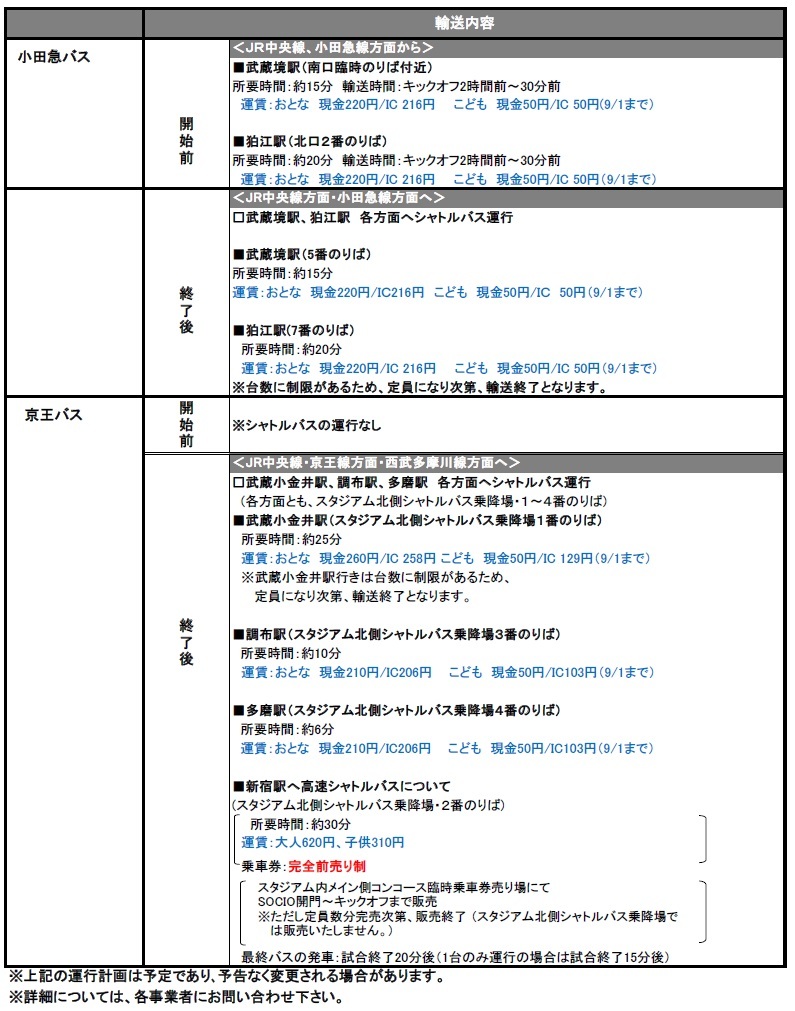 Am Sa., 03.08.2019, im 21. Spieltag der Meiji Yasuda J1 League gegen Cerezo Osaka (Anpfiff 19:00 / Ajinomoto Stadium) informieren wir über den Betrieb der Shuttle- und Linienbusse.