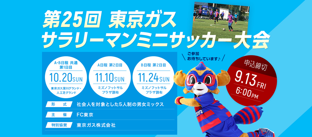 Auch in diesem Jahr ist wieder die Zeit für das „Mini-Fußballturnier für Berufstätige“ gekommen! Schwitzen Sie gemeinsam mit Freunden, die FC Tokyo lieben, und vertreiben Sie den Alltagsstress. Das Turnier ist freundlich gestaltet und für alle Teilnehmer geeignet, unabhängig von deren Fußballerfahrung. Bitte prüfen Sie die Details unten und bewerben Sie sich fleißig über das Anmeldeformular. Wir freuen uns auf Ihre Teilnahme.