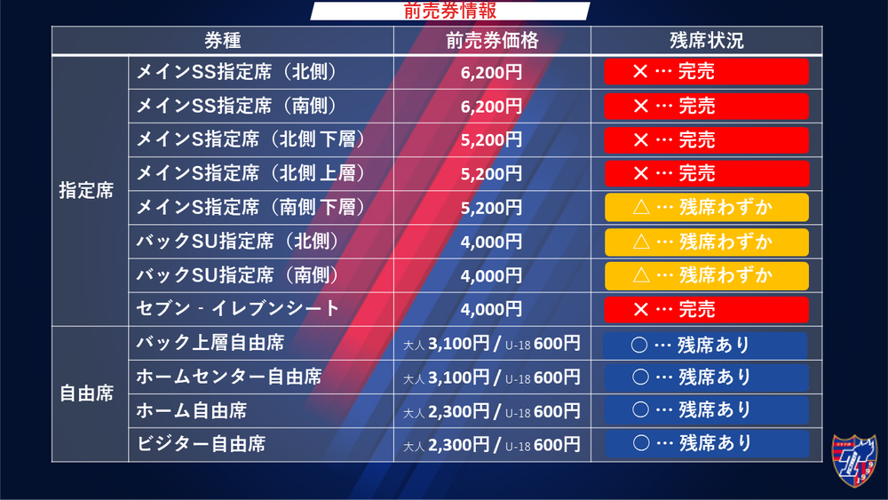 ※ Im FC Tokyo-Fanbereich (alle Heim-Dauersitzplätze, obere freie Sitzplätze auf der Heimseite der Hintertortribüne, freie Sitzplätze im Heimzentrum, freie Heimplätze) ist jegliche Unterstützung der Gastmannschaft untersagt.