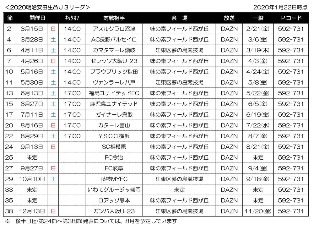 Der Heimspielplan der Saison 2020 für FC Tokyo U-23 wurde wie folgt festgelegt und wird hiermit bekanntgegeben.
