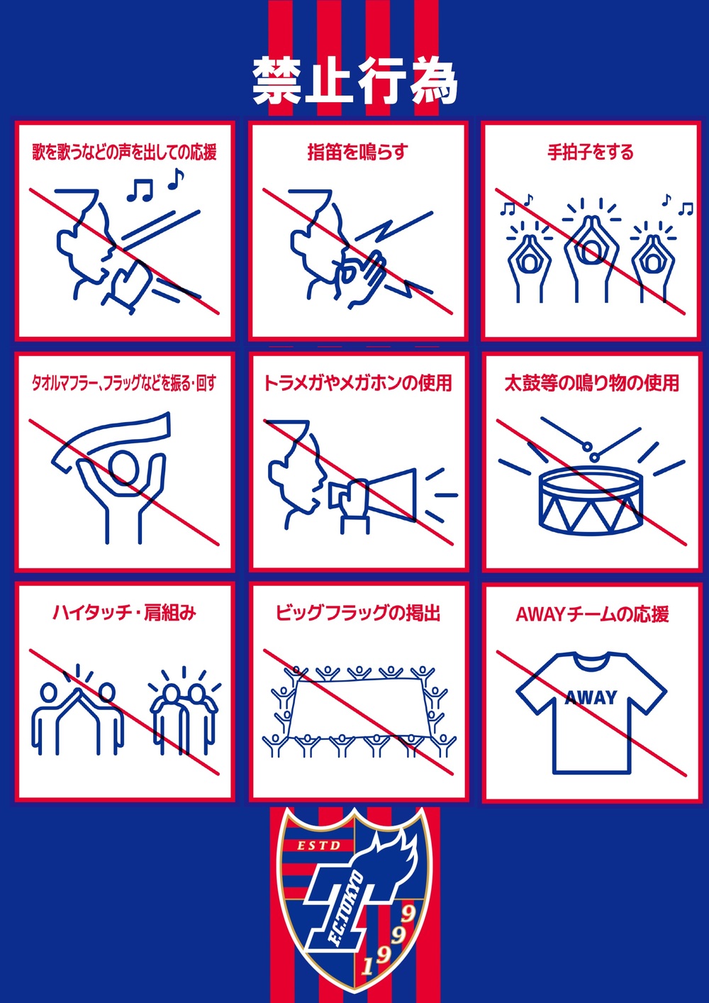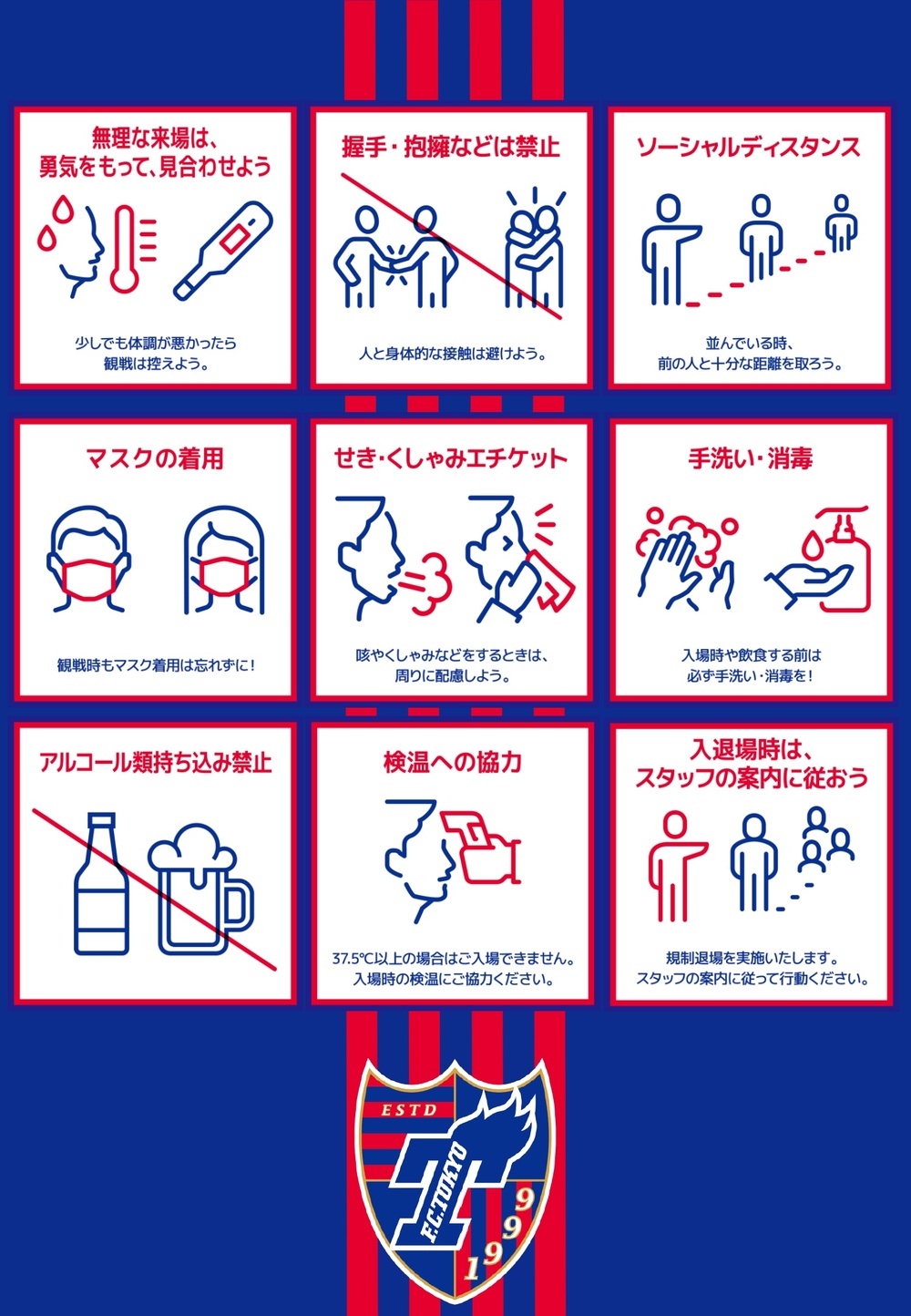 Bitte beachten Sie die einheitlichen Verbotsregeln der J-League (gemeinsame Verhaltensregeln und Vorschriften für Zuschauer der J-League) sowie die FC Tokyo Fußballspiel-Betriebsordnung und die J-League Leitlinien zum Umgang mit COVID-19.
