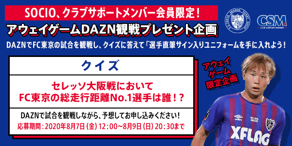 Damit SOCIO- und Club-Support-Mitglieder die Auswärtsspiele von FC Tokyo genießen und ansehen können, führen wir als spezielle Auswärts-Spielaktion die „DAZN-Auswärtsspiel-Zuschauer-Geschenkaktion“ durch.