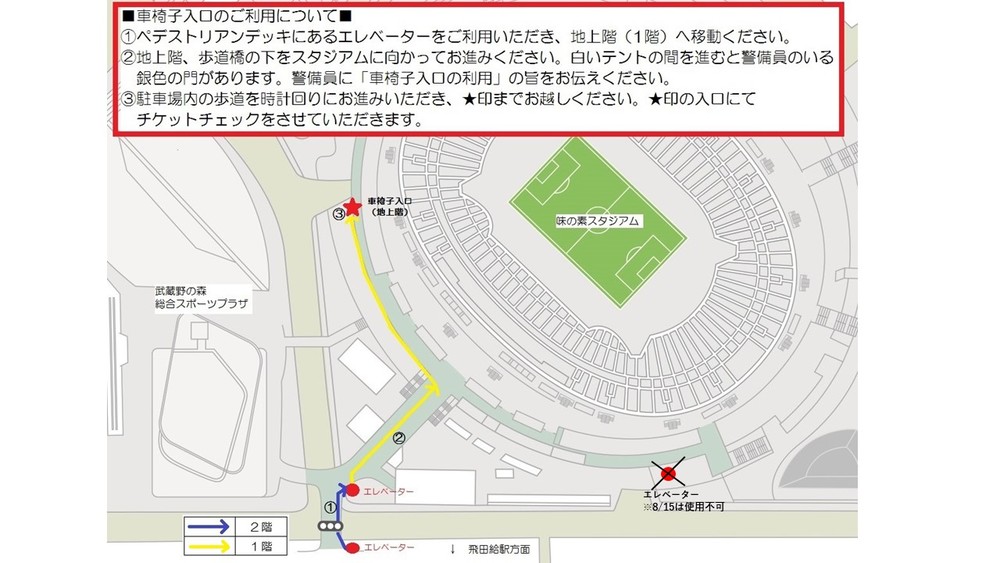 Bezüglich der Rollstuhlplätze, Behindertenparkplätze und Induktionsschleifenplätze beim Spiel gegen Kashima am Mi., 26.08., ist aufgrund der geplanten Durchführung des Spiels unter „extrem strengen Sicherheitsmaßnahmen (starke Beschränkungen)“ mit einer Zuschauerbegrenzung auf 5.000 Personen die Betriebsweise wie unten beschrieben (entsprechend den Heimspielen im Juli und August).