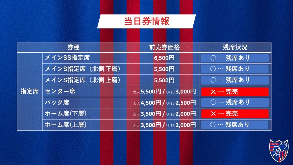 ※ Am Spieltag werden keine Tageskarten am Veranstaltungsort verkauft. Der Verkauf erfolgt ausschließlich über Ticket FC Tokyo (J-League Ticket) durchgeführt.