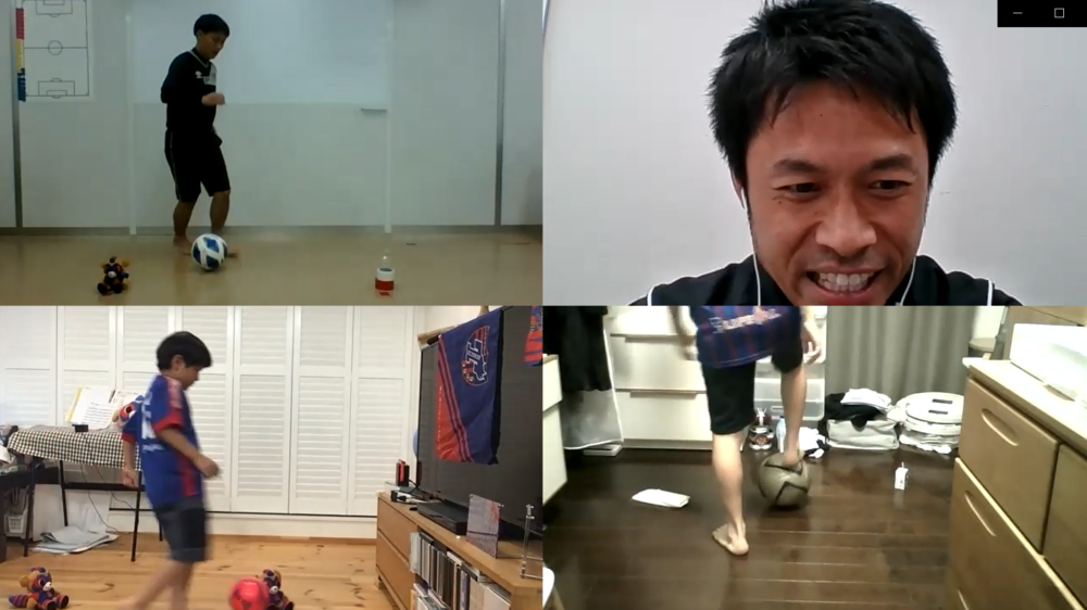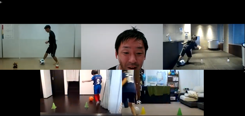 Über Zoom folgen wir den Bewegungen der Trainer und machen einfache Schritte, um viel Ballkontakt zu haben.