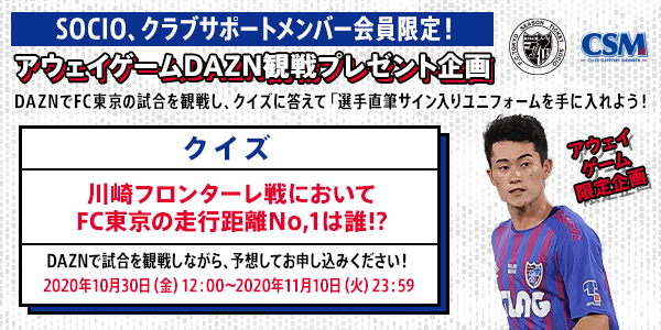 Damit SOCIO- und Club-Support-Mitglieder die Auswärtsspiele von FC Tokyo genießen und ansehen können, führen wir als besonderes Auswärtsspiel-Projekt die 10. Runde der Aktion „Erhalte ein Trikot mit originaler Unterschrift eines Spielers!“ durch.