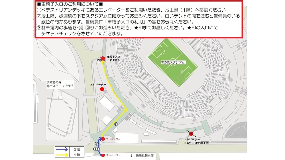 Bezüglich der Rollstuhlplätze, Behindertenparkplätze und Induktionsschleifenplätze beim Spiel gegen Vissel Kobe am Sa., 19.12., gelten die folgenden Regelungen. Wir bitten um Ihr Verständnis und Ihre Kooperation, auch wenn Unannehmlichkeiten entstehen sollten.