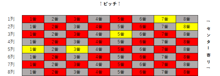 Im oben genannten Fall, wenn Sie automatisch auswählen und 2 Tickets kaufen, sind „Reihe 5 Platz 1 und Reihe 5 Platz 3 nebeneinander frei“, aber bei der automatischen Auswahl werden Plätze, die „dem Spielfeld am nächsten“ und „dem zentralen Bereich am nächsten“ sind, automatisch ausgewählt, daher werden „Reihe 1 Platz 7 und Reihe 2 Platz 8“ ausgewählt.