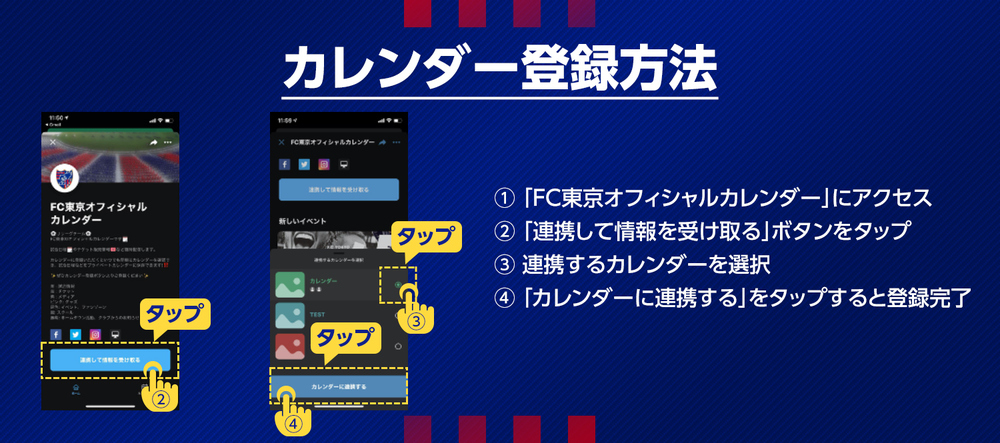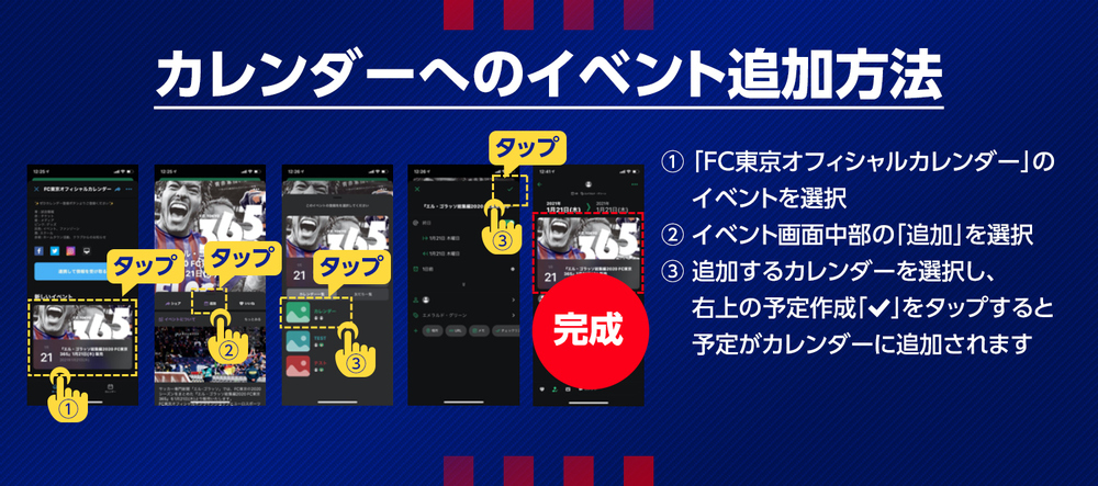Wenn Sie die Informationen des „FC Tokyo Official Calendar“ in Ihren eigenen Kalender eintragen, erhalten Sie Erinnerungen und können die Informationen ohne Verluste überprüfen!