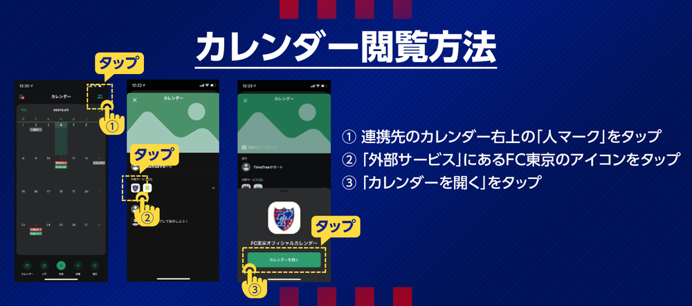 In der Kalender-Sharing-App „TimeTree“ haben wir eine öffentliche Kalenderseite „FC Tokyo Offizieller Kalender“ eingerichtet, auf der verschiedene Informationen zu FC Tokyo wie Spielinformationen und Ticketverkaufspläne veröffentlicht werden.
