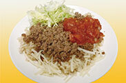 Ein beliebtes Gericht unseres Hauses: Spaghetti-Reis (eine Pasta-Version von Soba-Meshi) mit Peperoncino-Geschmack, serviert mit hausgemachter Bolognese-Sauce. Bitte probieren Sie es unbedingt.