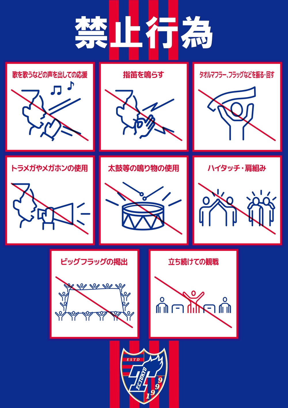 ※ Die Verwendung von Trommeln, Klatschpappen und anderen Schlaginstrumenten, die am eigenen Sitzplatz gespielt werden können, kann vom veranstaltenden Club erlaubt werden. FC Tokyo verbietet diese jedoch weiterhin sowohl für FC Tokyo als auch für die Gastmannschaft, um die Ausbreitung von Infektionen zu verhindern und Konflikte unter den Besuchern zu vermeiden.