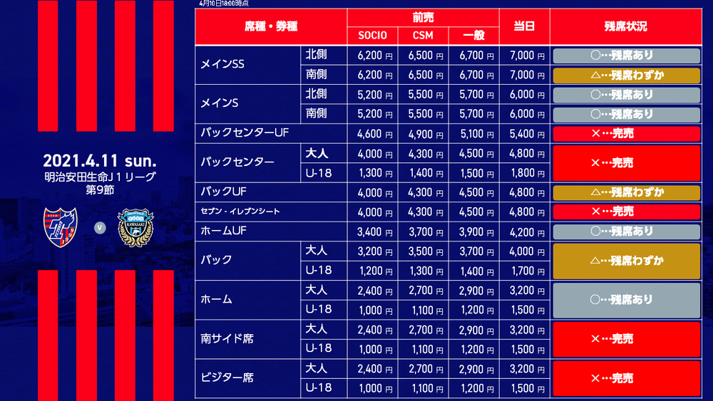 ※ Am Spieltag werden keine Tageskarten am Veranstaltungsort verkauft. Der Verkauf erfolgt ausschließlich über Ticket FC Tokyo (J-League Ticket).