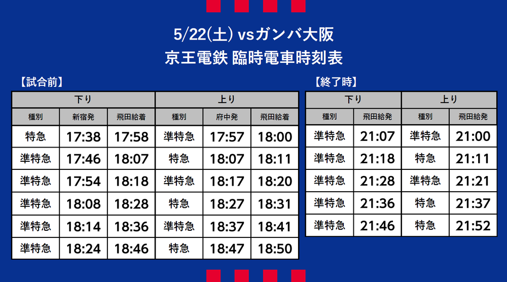 Sa., 22.05.2021 Meiji Yasuda J1 League, 15. Spieltag vs Gamba Osaka (Anpfiff 19:00 / Ajinomoto Stadium) Informationen zur vorübergehenden Verkehrsanbindung (Bahn) an diesem Tag.
