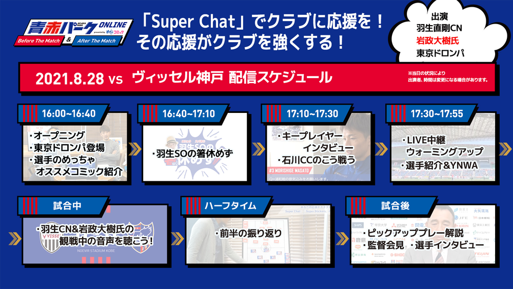 • Sa., 28.08. Ankündigung zur Veranstaltung des Spiels gegen Kobe „AO-AKA PARK Online Before/After The Match präsentiert von mechacomic“