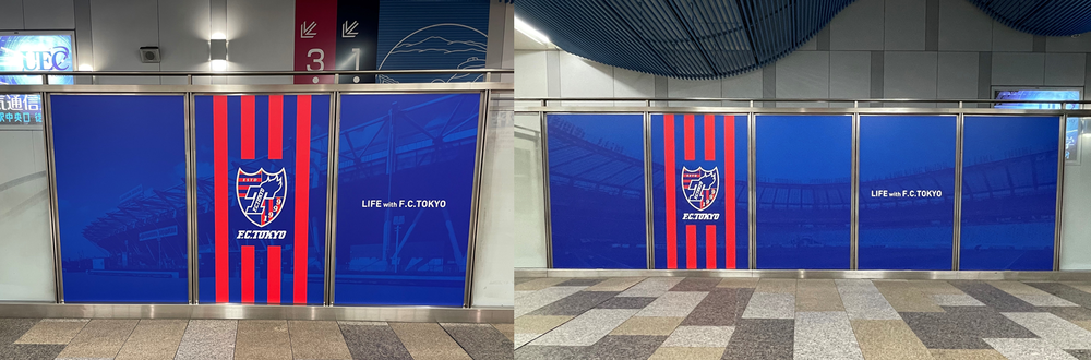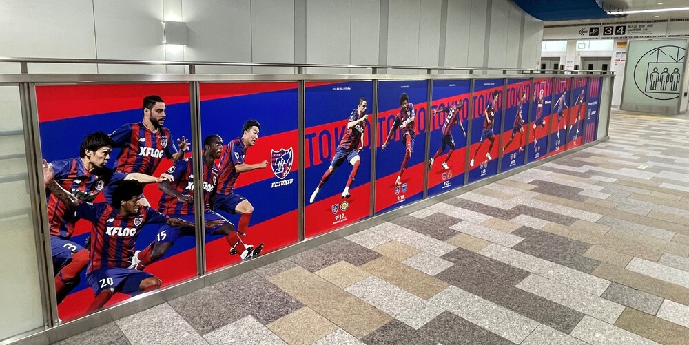 Die Glasplatten an den Wänden und die Treppe am Haupteingang des Keio-Eisenbahn-Bahnhofs Chofu werden mit FC Tokyo-Visuals dekoriert.