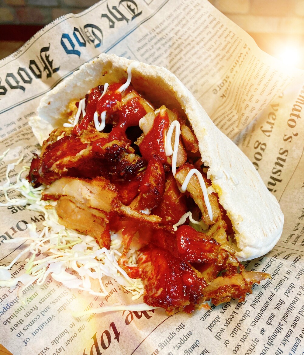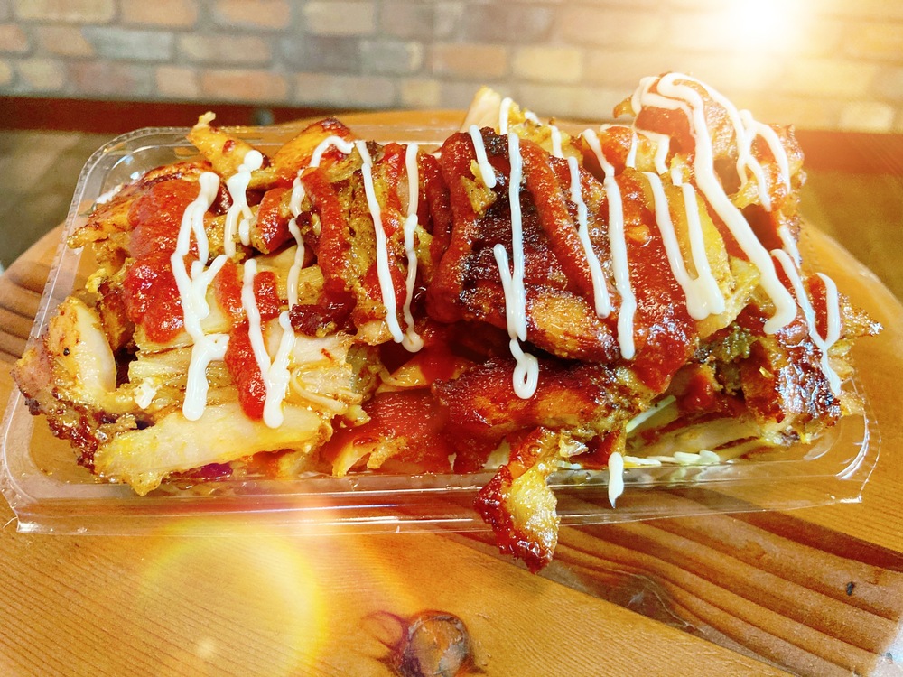 Hühnchenschenkel, mariniert in einer einzigartigen Gewürzmischung, werden langsam auf einem speziellen Grill gegart und direkt vor den Augen der Gäste aufgeschnitten. Ohne Pitabrot können Sie das Fleisch pur genießen.