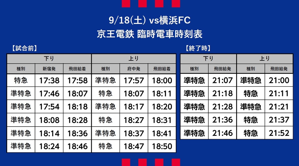 Am Sa., 18.09.2021, Meiji Yasuda J1 League, 29. Spieltag, vs Yokohama FC (Anpfiff 19:00 / Ajinomoto Stadium), informieren wir Sie über den Sonderverkehr (Bahn), Shuttlebus- und Linienbusverbindungen.