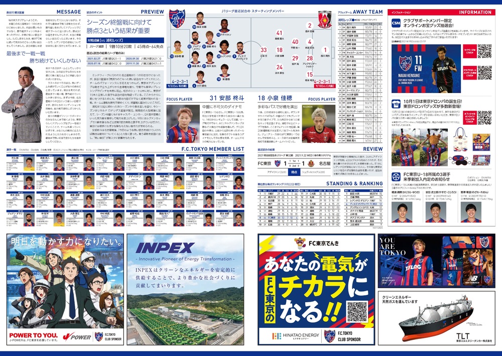 Sa., 25.09.2021 Meiji Yasuda J1 League, 30. Spieltag vs Urawa Reds (Anstoß 15:00 / Ajinomoto Stadium) Offizielles Matchday-Programm, Informationen wie folgt.