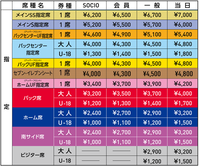 ※ Die Sitzplatzarten, bei denen das Tragen von Trikots und Fanartikeln des Besucherteams sowie das Unterstützen des Besucherteams erlaubt sind, sind die oben genannten „Haupt-SS-Reservierte Plätze Südseite“, „Haupt-S-Reservierte Plätze Südseite“ und „Besucherplätze“. Alle anderen Sitzplatzarten sind Unterstützerplätze von FC Tokyo.