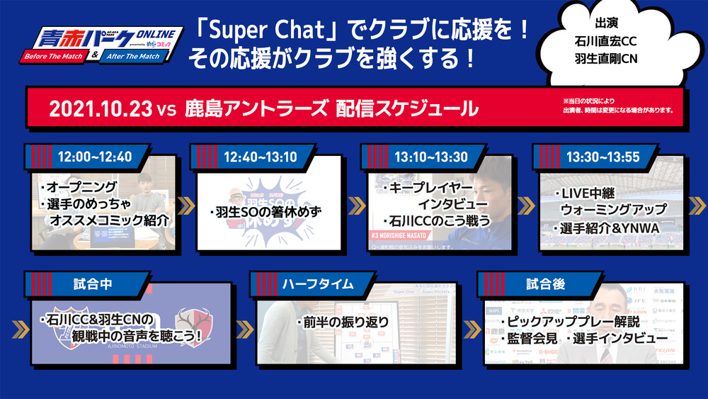 Sa., 23.10. Ankündigung zur Veranstaltung von „AO-AKA PARK Online Before/After The Match presented by mechacomic“ beim Spiel gegen Kashima