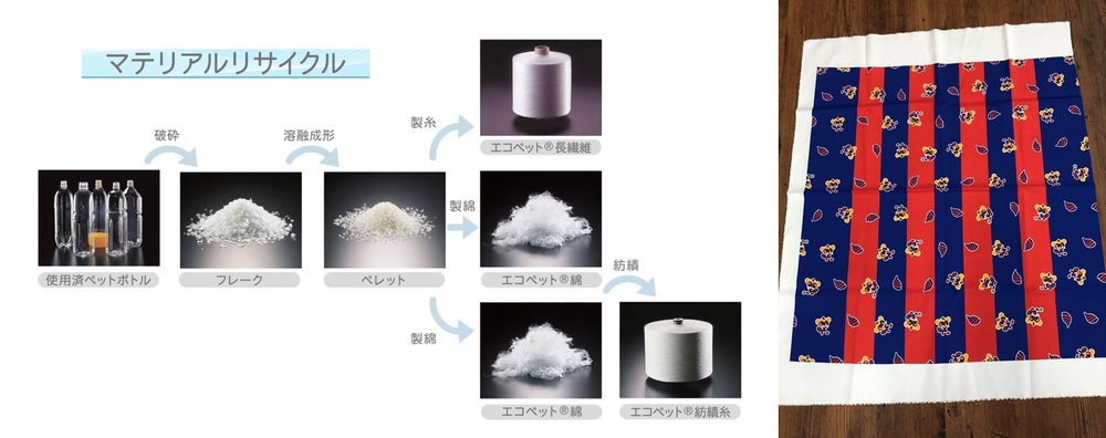 ②Zerkleinert und eingeschmolzen werden die PET-Flaschen zu Polyesterfasern und Stoffen umgewandelt.