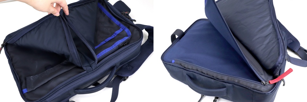 Die beim Erweitern sichtbaren Netzfächer sind jeweils zwei auf der linken und rechten Seite, sodass kleine Gegenstände getrennt aufbewahrt werden können. Der Hauptreißverschluss ist auf beiden Seiten angebracht und kann von beiden Seiten geöffnet und geschlossen werden, sodass das Öffnen und Schließen weder in der rechten noch in der linken Hand erschwert wird.