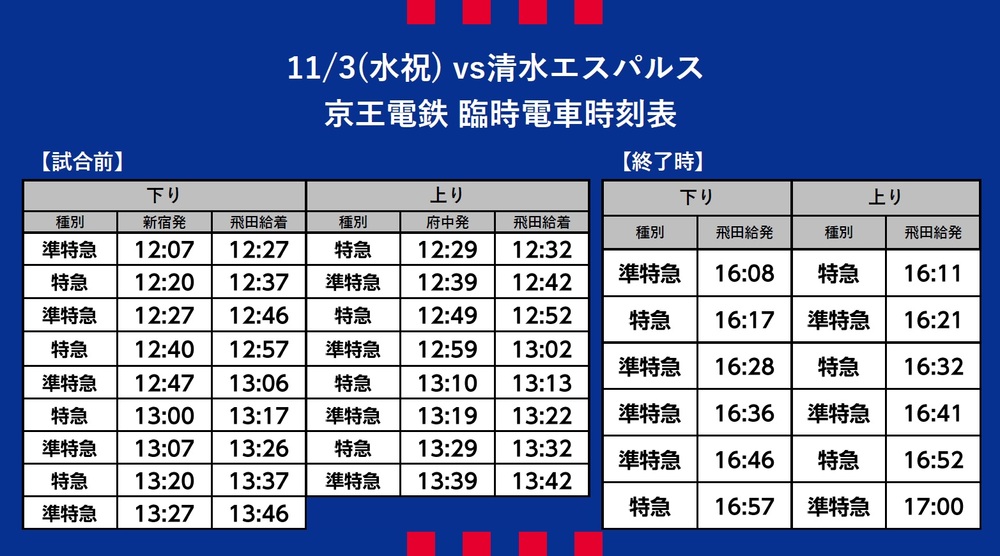 Mi., 03.11.2021 Meiji Yasuda J1 League, 34. Spieltag vs Shimizu S-Pulse (Anpfiff 14:00 / Ajinomoto Stadium) Informationen zu den eingesetzten Sonderverkehren (Bahn), Shuttle- und Linienbussen.