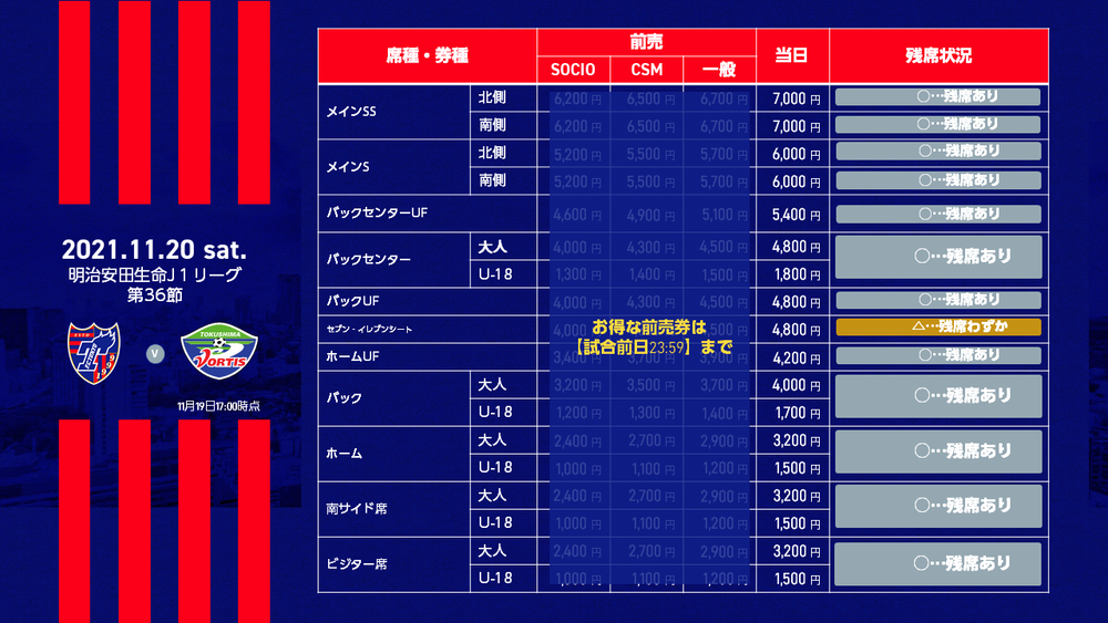 Zum Verkauf von Tageskarten für das Spiel der 36. Runde der Meiji Yasuda J1 League 2021 FC Tokyo vs Tokushima Vortis (Anpfiff 14:00 / Ajinomoto Stadium) informieren wir Sie wie folgt.