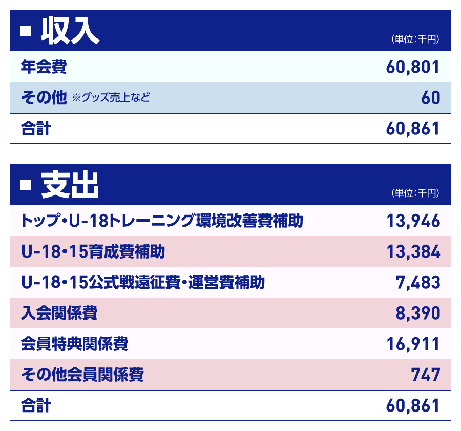 Die Saison 2021, die im Zeichen der Corona-Pandemie stand, war wie bereits die Saison 2020 von Einschränkungen bei der Austragung der Heimspiele geprägt. Dennoch haben uns viele von Ihnen tatkräftig unterstützt, wofür wir uns aufrichtig bedanken. Die erste Mannschaft konnte leider nicht die erwarteten Ergebnisse erzielen, doch in der dichten Spielplanphase zu Beginn der Saison trugen zahlreiche U-18-Spieler in den Spielen des Levain Cups zum Sieg des Teams bei und zeigten so den Zusammenhalt des gesamten Clubs. Zudem gewann die U-15-Mannschaft Musashi die 36. Ausgabe der Japanischen Club-Youth-Fußballmeisterschaft (U-15) und konnte damit allen eine stetige Entwicklung demonstrieren. Für die Saison 2022 wurden die U-18-Spieler Kojiro YASUDA, Yuki KAJIURA und Leon NOZAWA in die erste Mannschaft befördert. Außerdem wird Shuto OKANIWA, der über die U-15 Fukagawa und U-18 Stationen an der Meiji-Universität erfolgreich war, zum Team stoßen. Ihre langjährige Unterstützung ist die Kraftquelle des Clubs, wofür wir nochmals unseren Dank aussprechen. Im Folgenden berichten wir über die Einnahmen und Ausgaben der Club-Support-Mitglieder für die Saison 2021, die durch Ihre Mitgliedsbeiträge ermöglicht wurden.