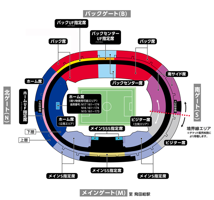 ※ Die Sitzplatzarten, bei denen das Tragen von Trikots und Fanartikeln des Besucherteams sowie das Unterstützen des Besucherteams erlaubt sind, sind die oben genannten „Haupt-SS-Reservierte Plätze Südseite“, „Haupt-S-Reservierte Plätze Südseite“ und „Besucherplätze“. Alle anderen Sitzplatzarten sind Unterstützerplätze von FC Tokyo.