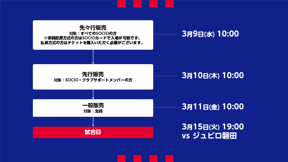 Gemäß den Leitlinien der J-League zur Bekämpfung der COVID-19-Pandemie wird durch die Erstellung und Umsetzung eines von der Regierung oder den Präfekturen festgelegten „Infektionsschutz-Sicherheitsplans“ die Stadionkapazität für die Saison 2022 ohne Sitzabstand verkauft. Für dieses Spiel bitten wir Sie jedoch, im Schachbrettmuster mit jeweils einem freien Sitzplatz vor, hinter und neben Ihnen Platz zu nehmen.
