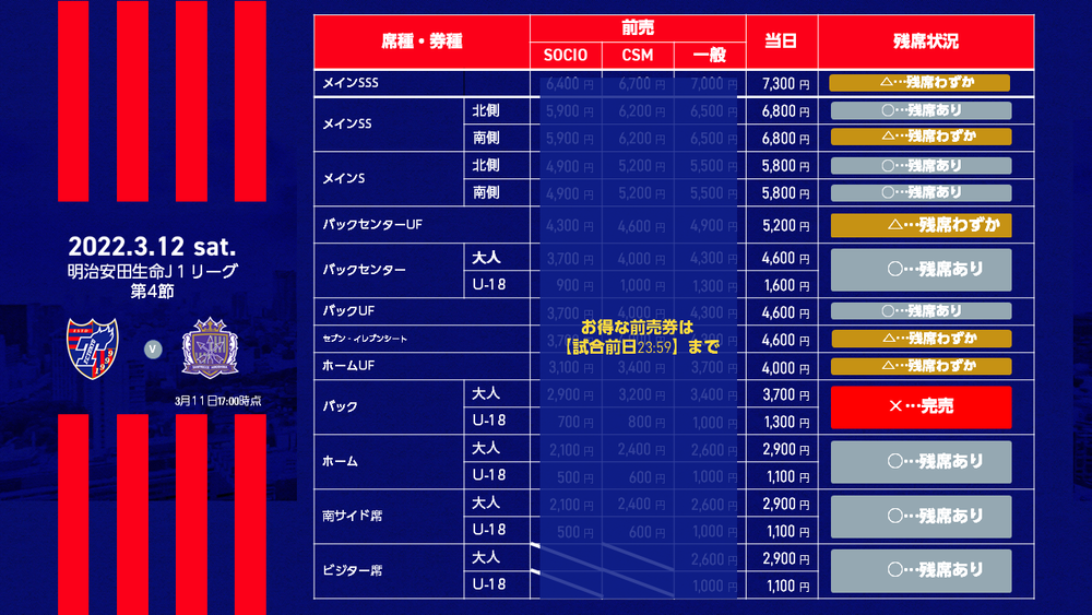 ※ Am Spieltag werden keine Tageskarten am Veranstaltungsort verkauft. Der Verkauf erfolgt ausschließlich über Ticket FC Tokyo (J-League Ticket).