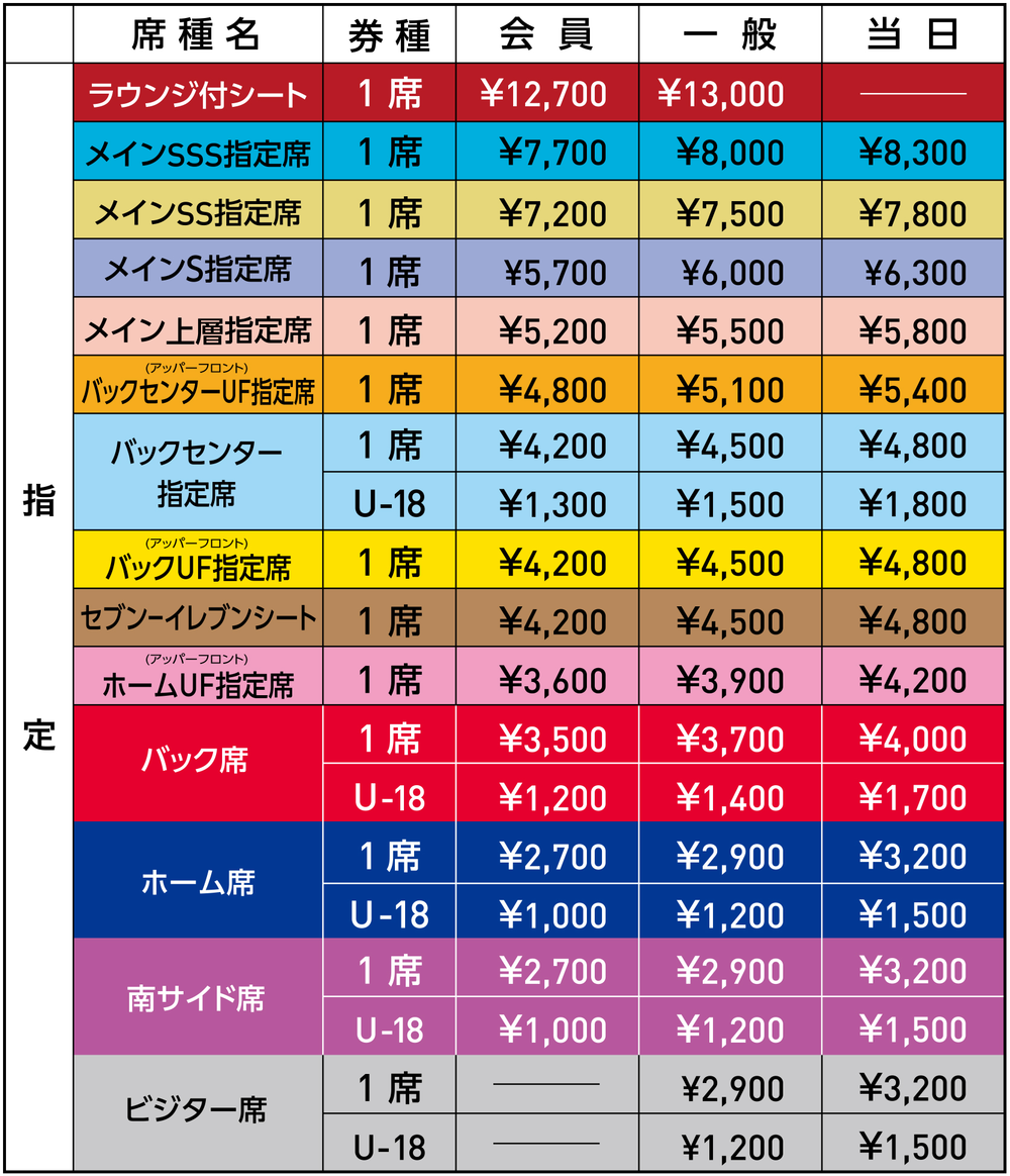 ※ Die Sitzplatzarten, bei denen das Tragen von Trikots und Fanartikeln des Besucherteams sowie das Unterstützen des Besucherteams erlaubt sind, sind die oben genannten „Haupt-SS-Reservierte Plätze Südseite“, „Haupt-S-Reservierte Plätze Südseite“ und „Besucherplätze“. Alle anderen Sitzplatzarten sind Unterstützerplätze von FC Tokyo.
