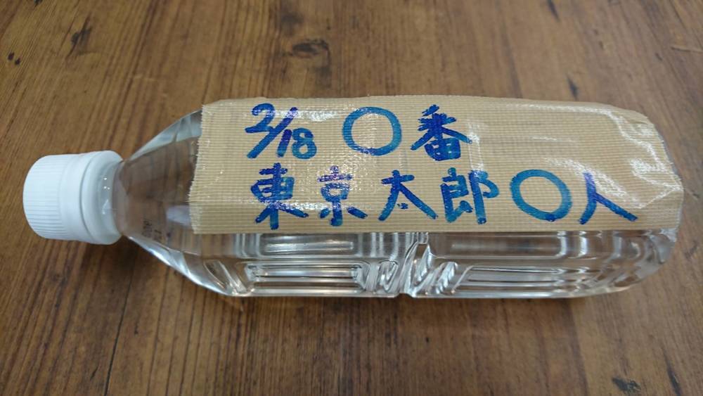 ・ Bitte vermerken Sie auf der PET-Flasche das Spiel-Datum, die Reihenfolge, den Namen des Vertreters und die Anzahl der Personen. (Siehe Abbildung unten, Beispielbild)